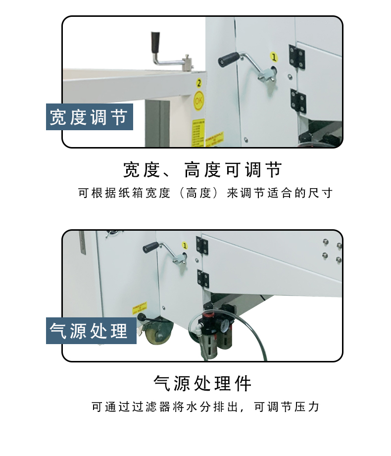 - 膠帶封底方式:如果是采用膠帶封底,機(jī)器會(huì)有一個(gè)膠帶供給系統(tǒng)。膠帶從卷筒上被引出,經(jīng)過(guò)一系列的導(dǎo)向輪,被引導(dǎo)至封底位置。在封底時(shí),首先會(huì)有一個(gè)裝置將膠帶的起始端粘貼在紙箱底部的一個(gè)折頁(yè)上,然后紙箱在輸送帶上移動(dòng),膠帶隨著紙箱的移動(dòng)而被拉出并粘貼在其他折頁(yè)上。當(dāng)膠帶環(huán)繞紙箱底部一周后,會(huì)有一個(gè)切斷裝置將膠帶切斷,最后通過(guò)一個(gè)壓輪等裝置將膠帶壓實(shí),確保粘貼牢固。